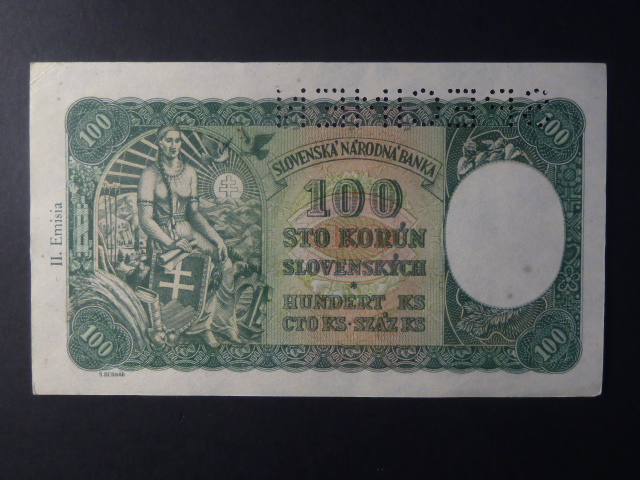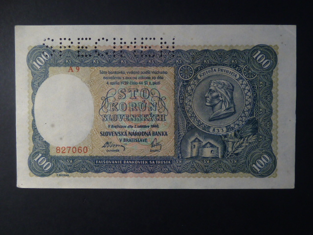 100 Ks 1940 II.vydání, série A 9, 1x perf. SPECIMEN nahoře