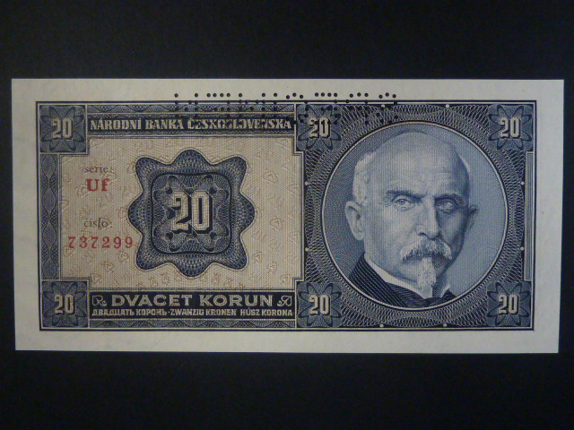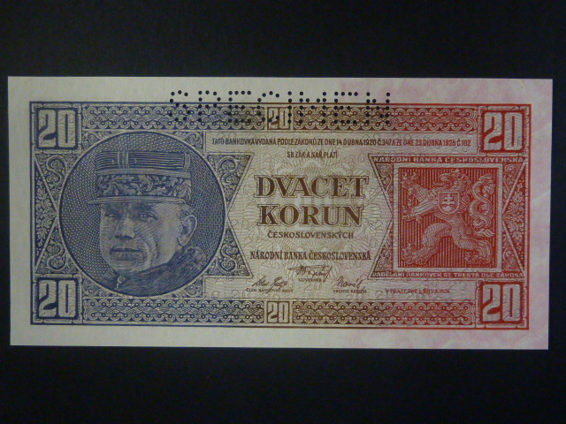 20 Kč 1926 série Uf, perf. SPECIMEN z líce