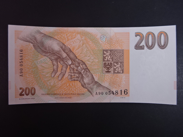 200 Kč 1993 série A 90 proužek Kčs, bílý papír