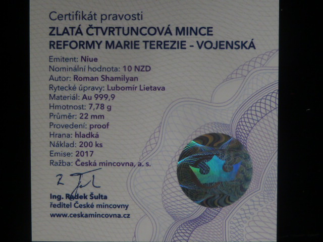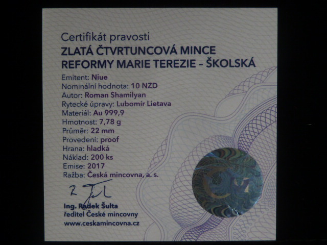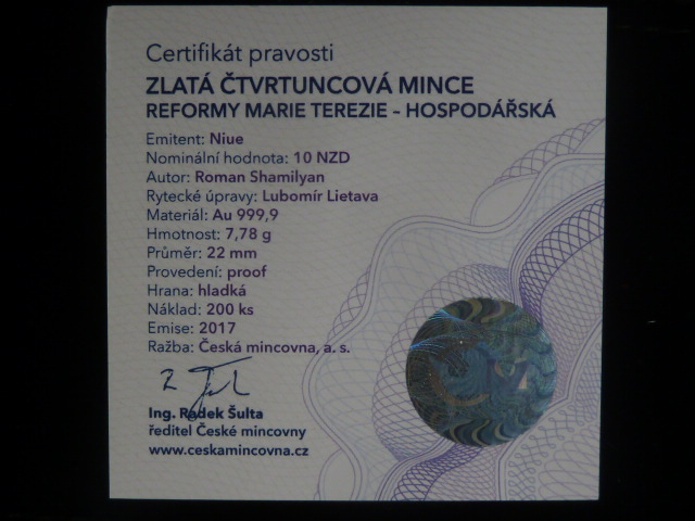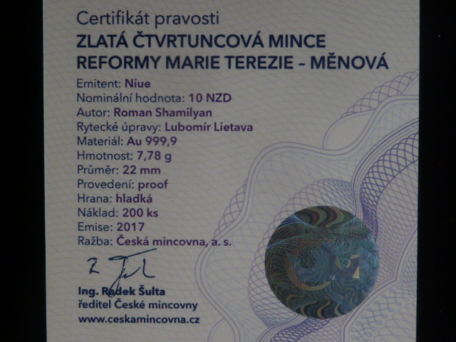 4x 10 Dollars 2017 Zlaté 1/4 OZ mince Reformy Marie Terezie, 1 OZ Au 0,999, 31,1g, Česká mincovna, náklad 200 ks