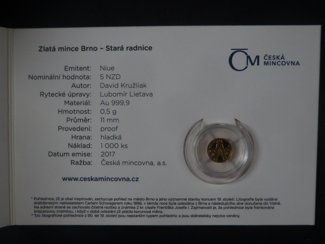 5 Dollar 2017 - Zlatá mince Brno: Stará radnice Au 999.9, 0,5 g