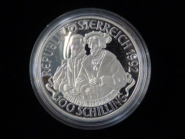 Ag 100 Schilling 1992 - Kaiser Karl V., 900/1000 Ag, etue + certifikát