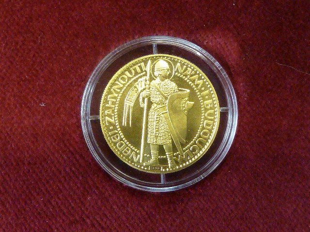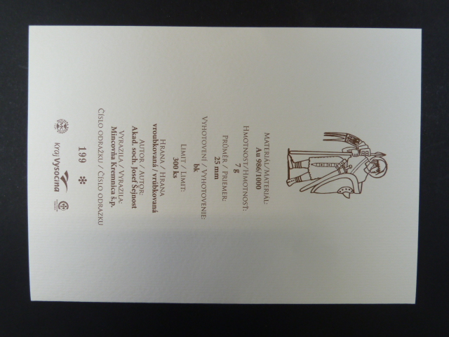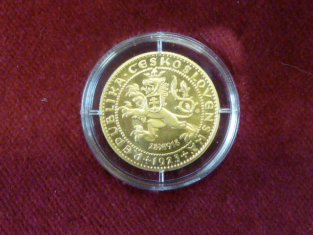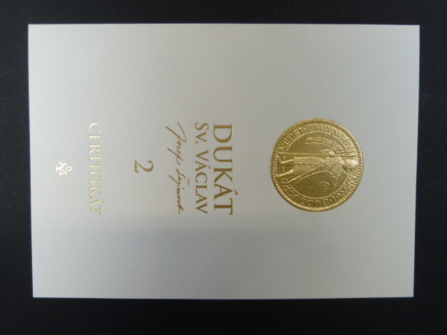 Jubilejní Svatováclavské dukáty, 2 dukát prvoražba návrhu Josefa Šejnosty z r. 1923, číslo 350, osvědčení o ryzosti z Puncovního úřadu, Au 986, 7g, průměr 25 mm, limit 300ks