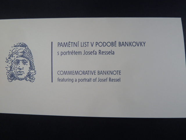 Pamětní tisk STC v podobě bankovky "1827", nazvaný „1827 Josef Ressel“ série R02 000018, vydala Státní tiskárna cenin, nové technologie tisku, mikroperforace, nový papír a ochranné prvky