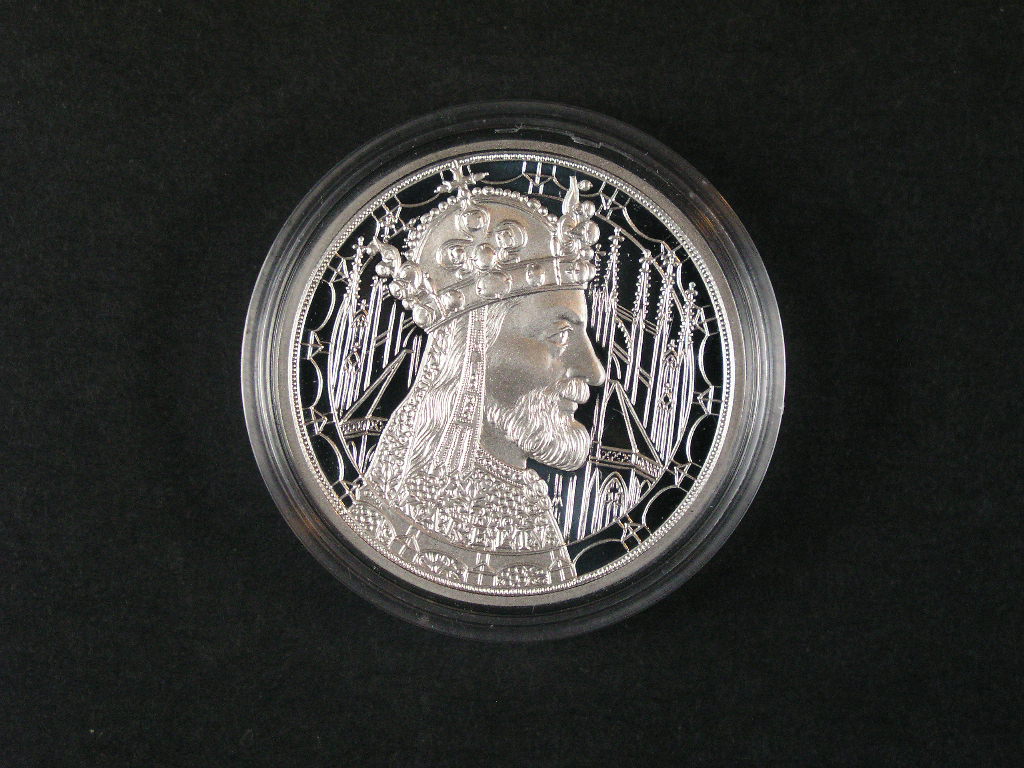 Stříbrná medaile s motivem Karla IV, punc Ag, ryzost 999, váha 16.1g
