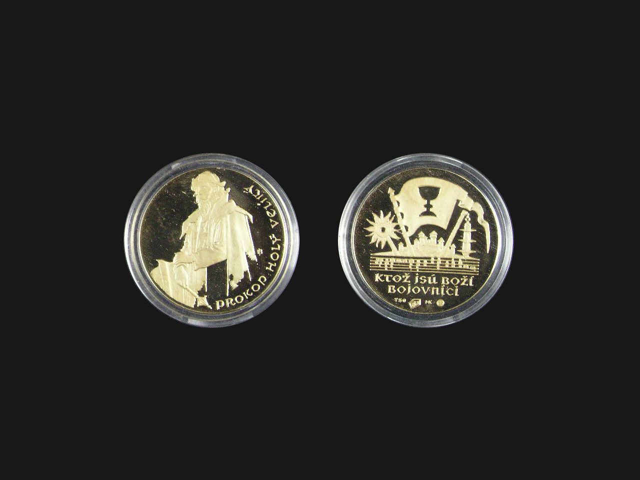 Zlatá medaile s vyobrazením Prokopa Holého, Au 750/1000, průměr 22 mm, váha 6 g, ražba Mincovna Kremnica