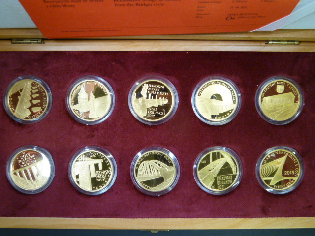 sada 10 ks pamětních mincí 5000 Kč 2011 - 2015 Mosty České Republiky v dřevěné etui, 10 x 1/2 OZ