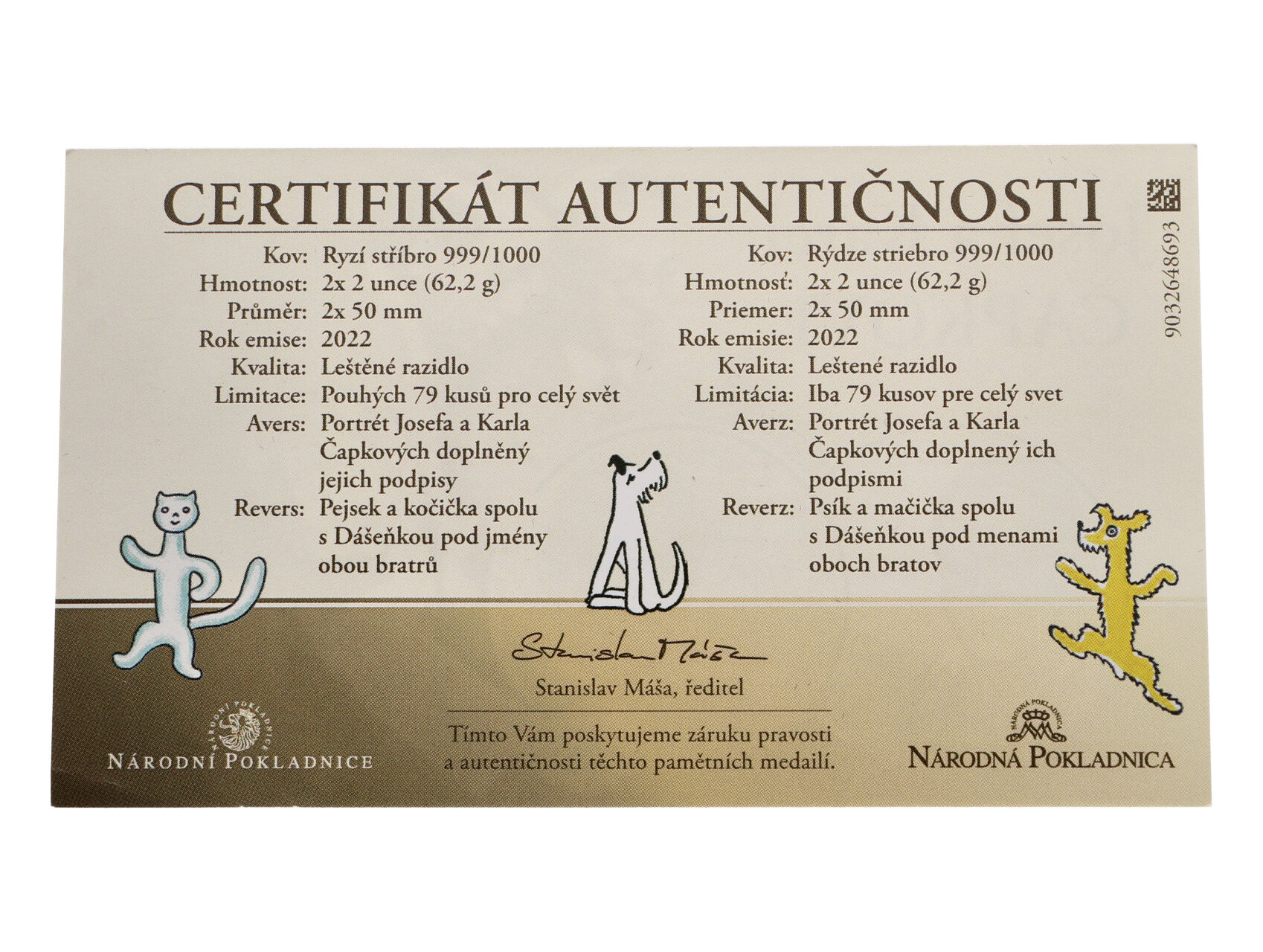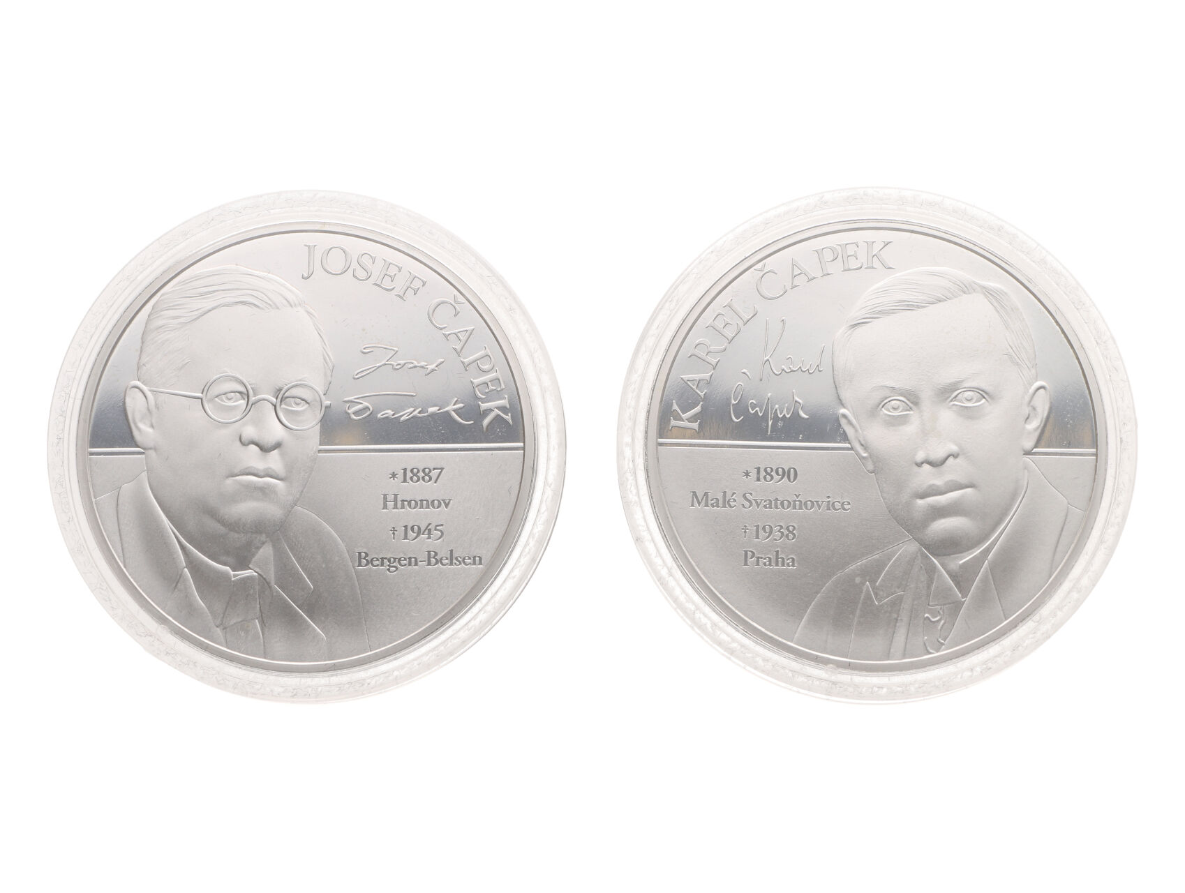 Sada 2 medailí Josef a Karel Čapek, 2x 2 Oz, 0.999 Ag, náklad jen 79ks, číslováno na hraně 16/79, uloženo v dřevěné etui_