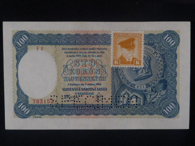 100 Ks 1940 II.vydání, kolkovaná série F 8, perf. SPECIMEN dole