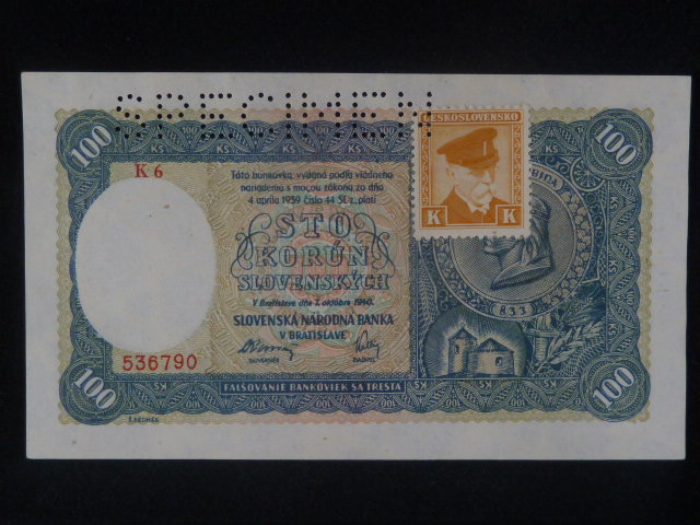 100 Ks 1940 II.vydání, kolkovaná série K 6, perf. SPECIMEN nahoře