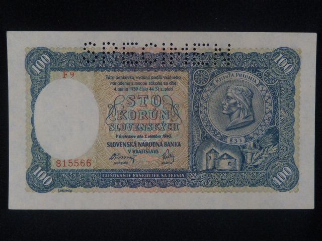 100 Ks 1940 II.vydání, série F 9, 1x perf. SPECIMEN nahoře