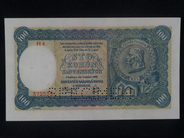 100 Ks 1940 II.vydání, série H 4, 1x perf. SPECIMEN dole
