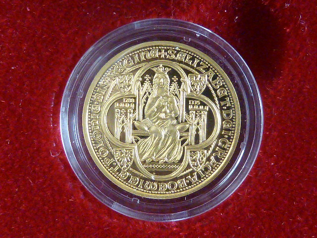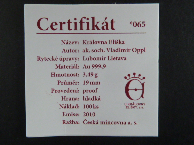 • 2010, pamětní dukátová medaile U královny Elišky, Au 999,9, 3,49g, číslovaná č.65, náklad 100ks, etue, certifikát