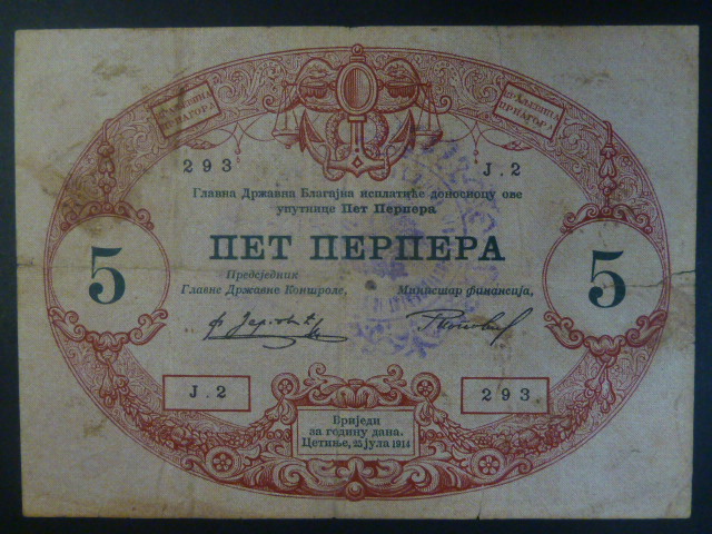 5 Perpera 1914 Montenegro, vojenské vydání, nečitelné razítko