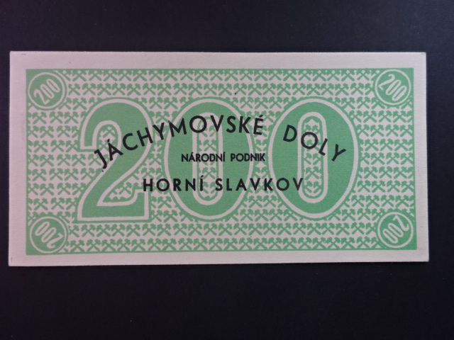 Jáchymovské doly n.p. Horní Slavkov, poukázka 200 K b.d. v zelené barvě