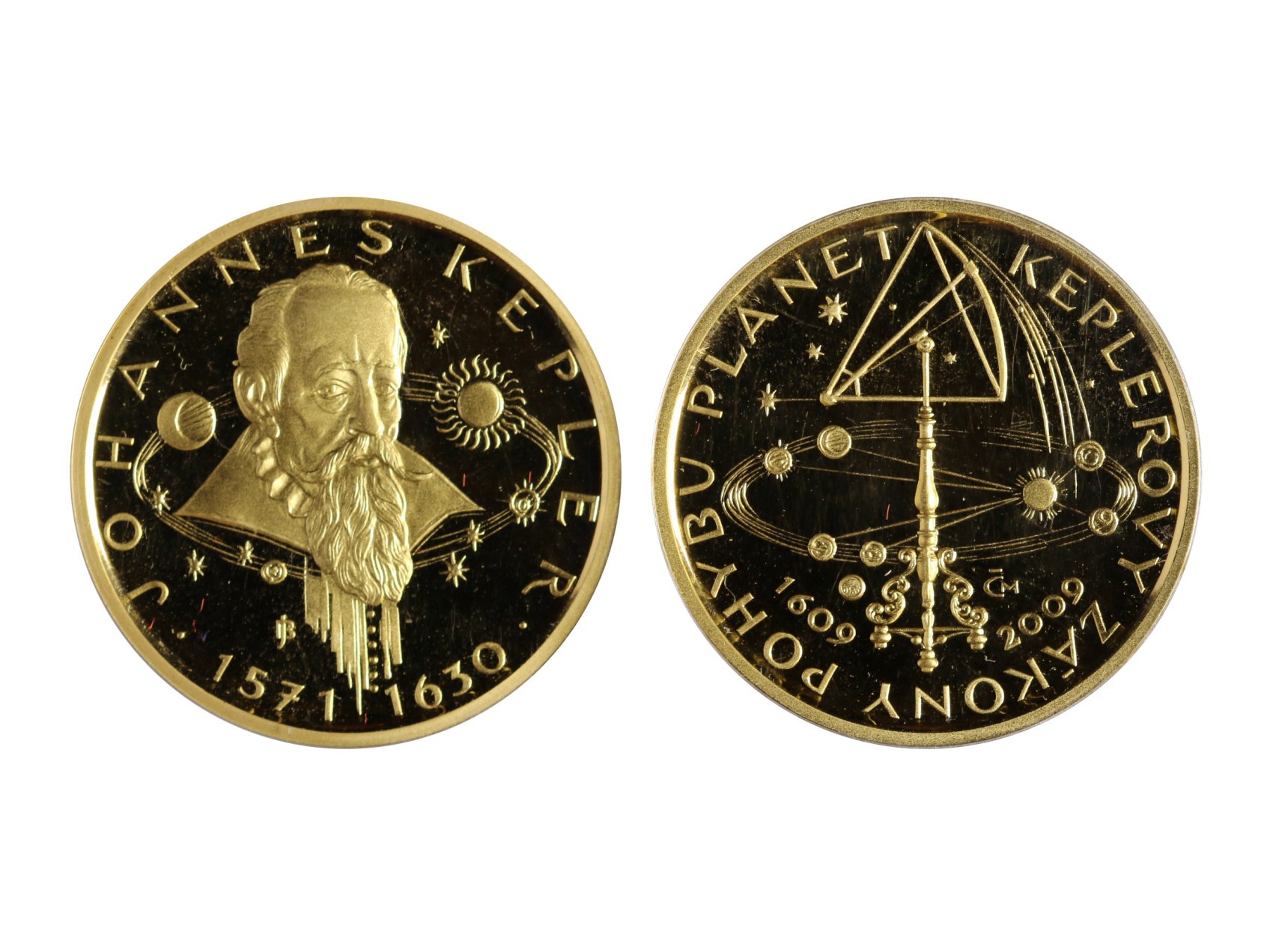 • 2009, Česká mincovna, zlatá medaile Keplerovy Zákony, Au 0,999, 15,56g (1/2 UNZ), průměr 28mm, náklad 600 ks, č. 195, etue, certifikát