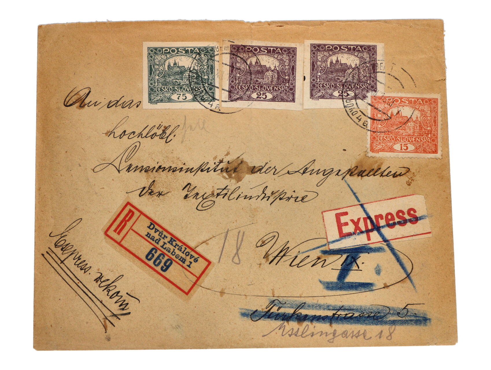 R-EXPRES dopis do Vídně frank. zn. č. 7 F, 11 typ II (2x), 18, pod. raz. DVŮR KRÁLOVÉ 13.12.19