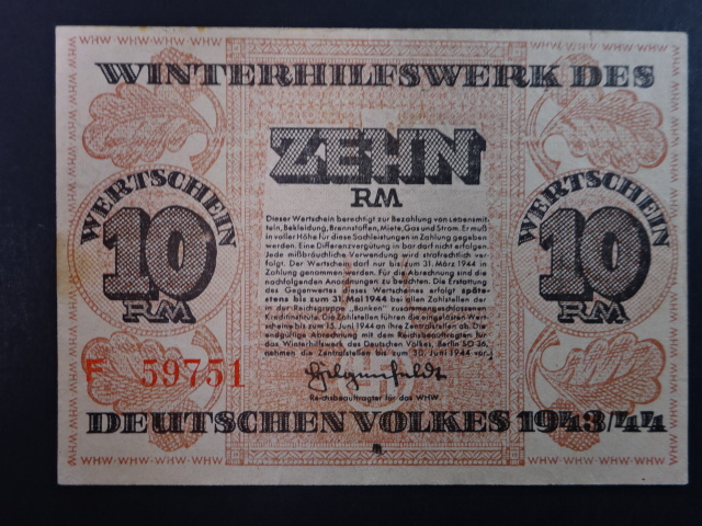 Winterhilfswerk 1934-1944 (Zimní pomoc), 10 RM 1943/1944 série F, Ro. 747, Grab. WHW-42