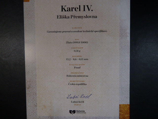 Au medaile kolekce cihliček Karla IV, 0.31 g, Au .999